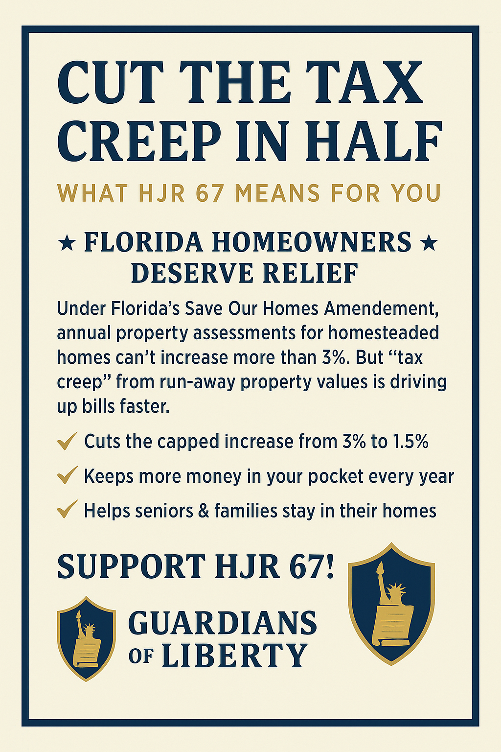 Guardians of Liberty proudly supports HJR 67 as part of our Property Tax Reform & Spending Accountability Initiative, ensuring real relief for Florida families while holding local governments accountable for every dollar spent.